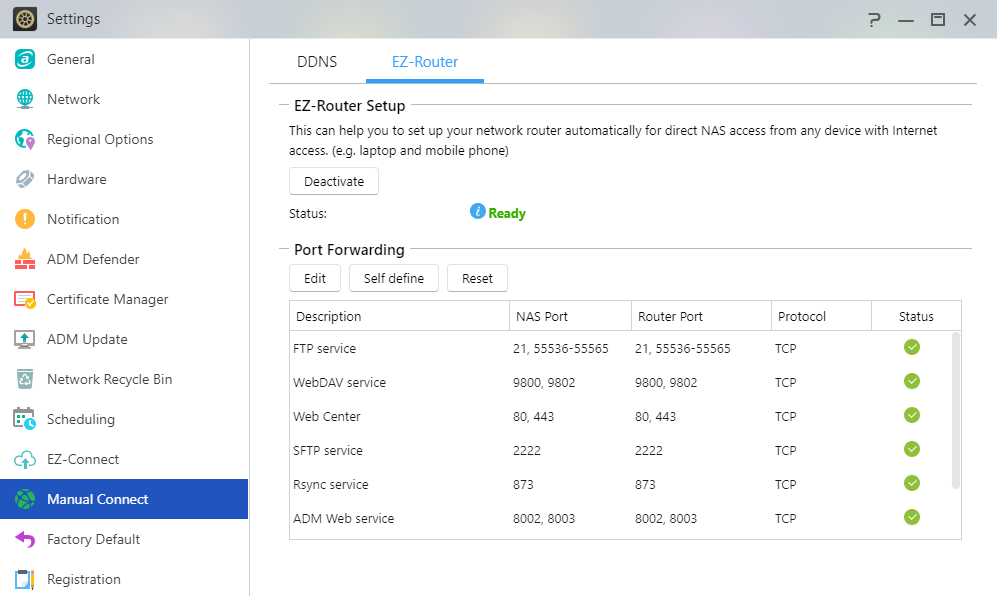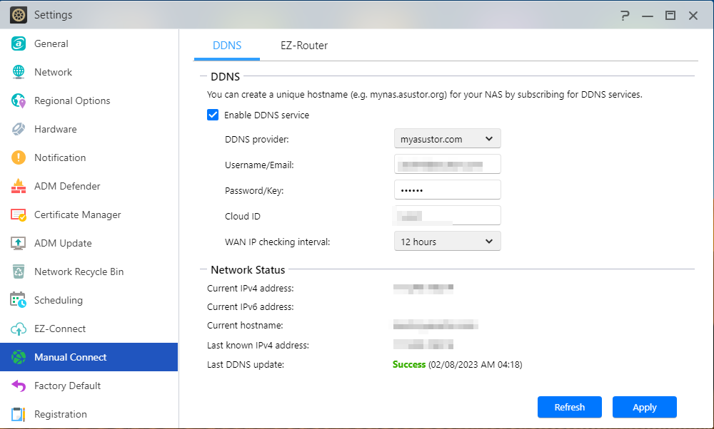 1. Log in to ADM and then select [Settings] > [Manual Connect] > [DDNS]. Make sure that the DDNS settings are