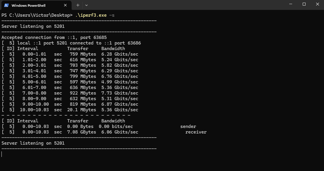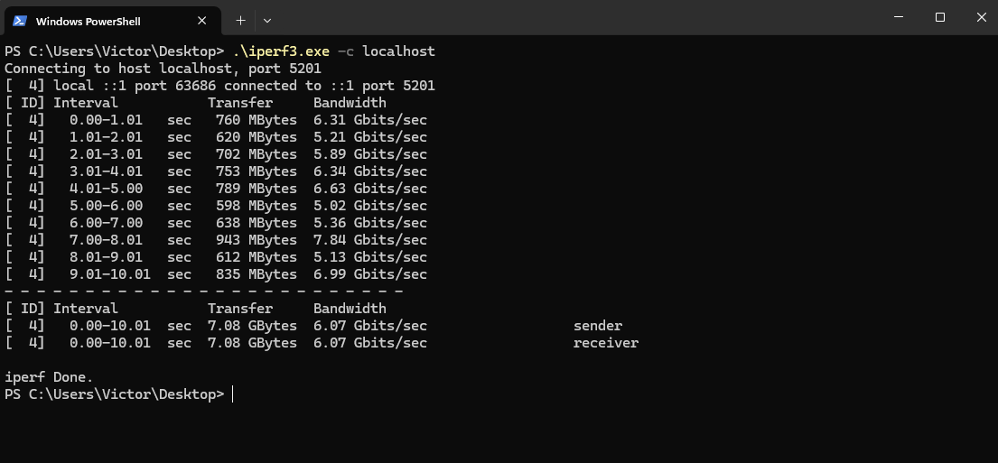 3. PC: conectarse por Powershell y escribir el siguiente comando: .\iperf3.exe -c localhost