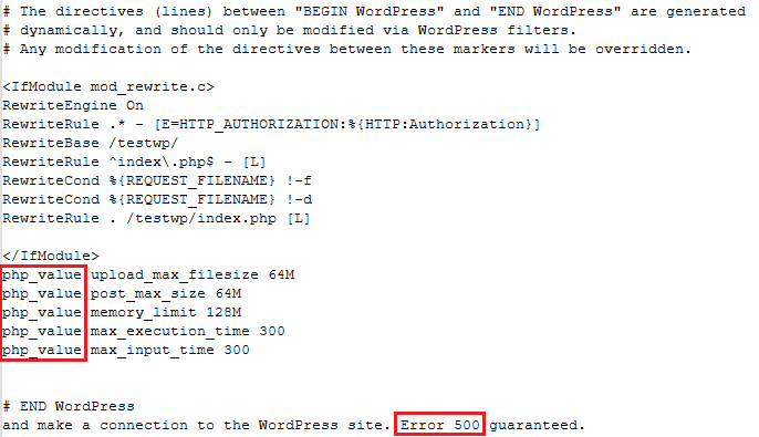 El error 500 ocurre porque la directiva php_value no es reconocida.