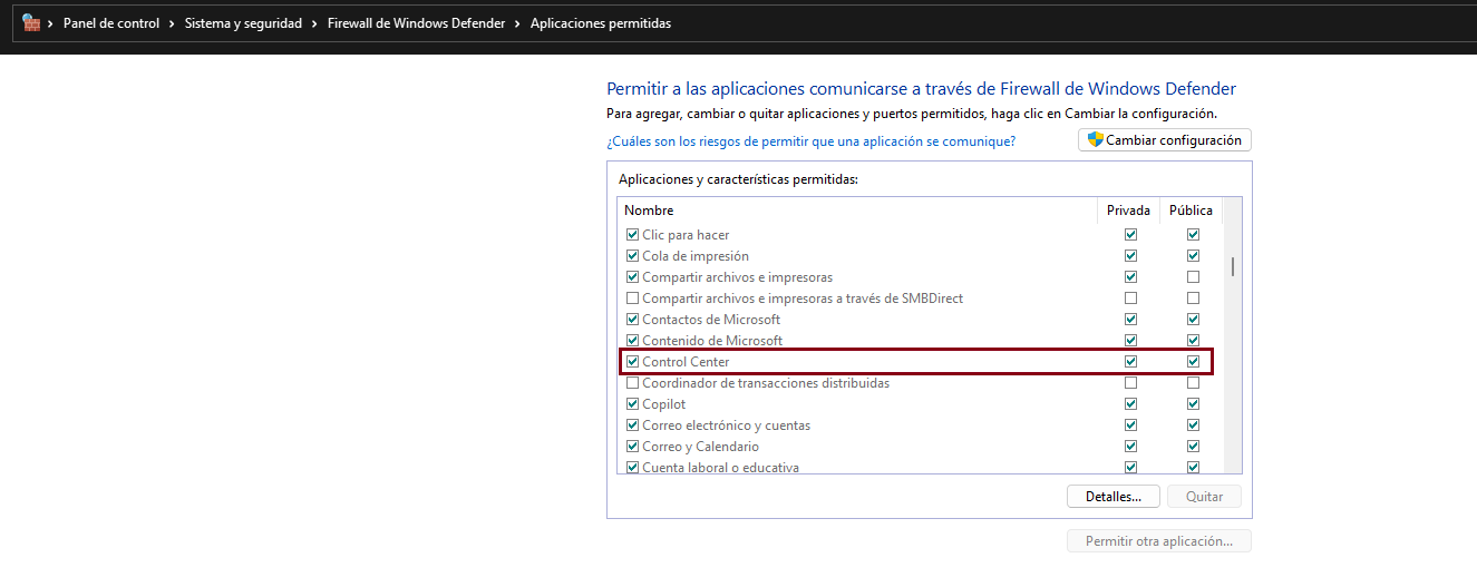 Además, verificar que la función del Control Center esté habilitada en el firewall de Windows. Para ello, ve a Panel de control > Sistema y seguridad > Firewall de Windows Defender > Aplicaciones permitidas y asegúrate de que Asustor Control Center esté permitido.