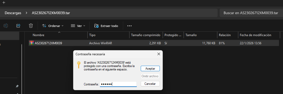 Por ejemplo, si el nombre del archivo es 'AS23026712XM0039', la contraseña será 'XM0039'. Es importante recordar que la contraseña debe ingresarse en mayúsculas.
