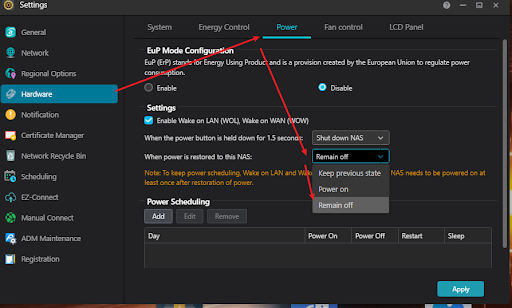 Con la opción write 0x44 remain off, el NAS permanecerá apagado independientemente de si se apaga, se desconecta o se vuelve a encender directamente.