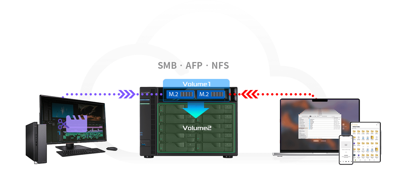 I dispositivi NAS ASUSTOR sono compatibili con tutti i tipi di dischi rigidi SATA/SSD ad alta capacità venduti ad oggi. Che tu sia a casa o in ufficio, il tuo MacBook Pro e altri computer possono sfruttare Safari, SMB, AFP e NFS per connettersi al tuo NAS mentre AiData per il tuo iPhone, iPad o dispositivo Android assicura che anche il tuo smartphone o tablet non è mai lontano dai tuoi dati.