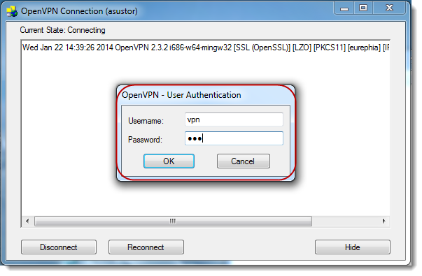 VPNサーバーの [name] と [Password] を入力し、 [OK] をクリックします。