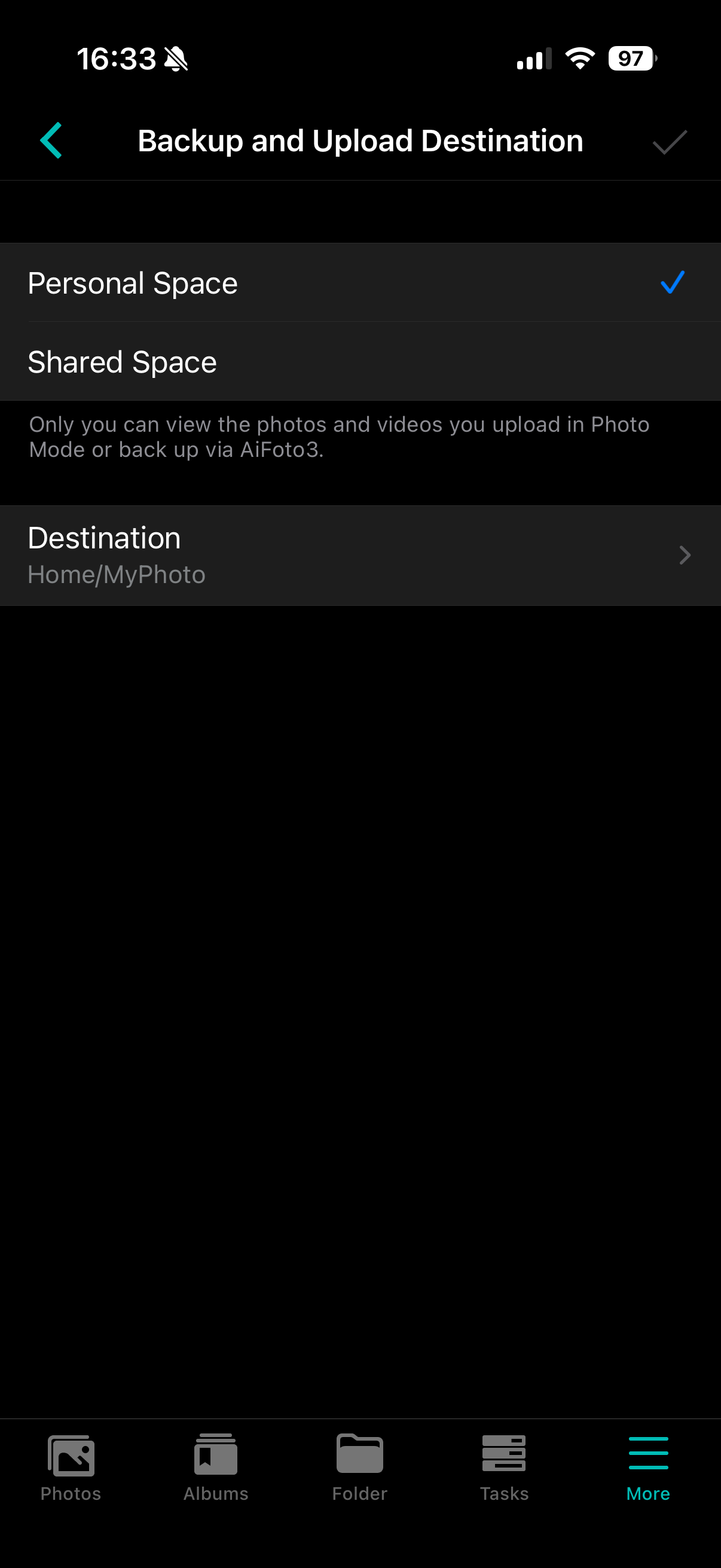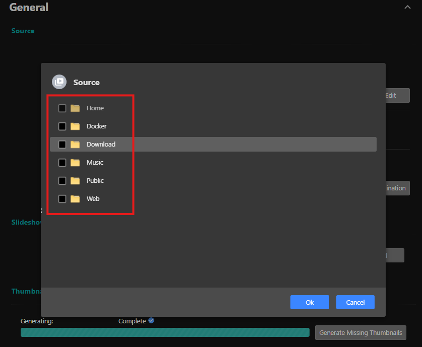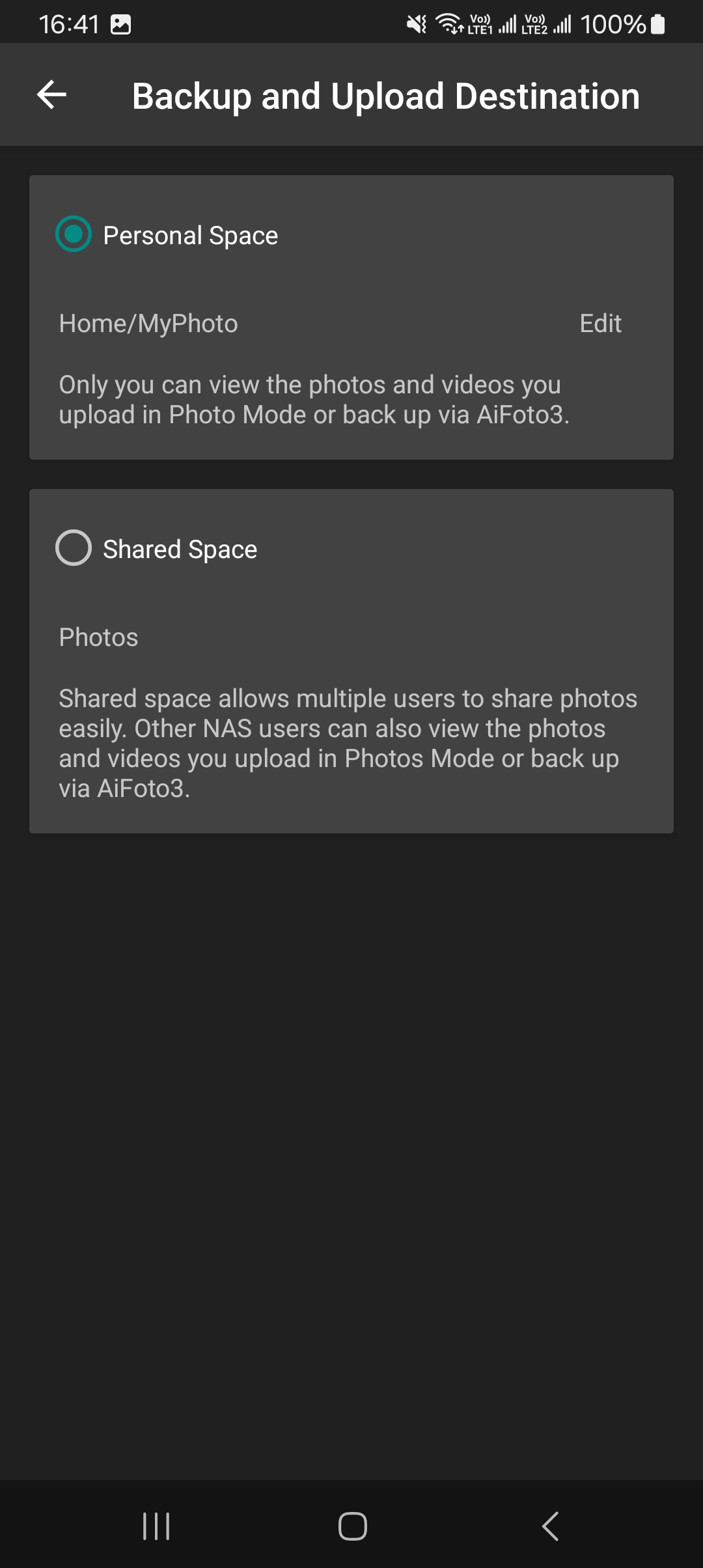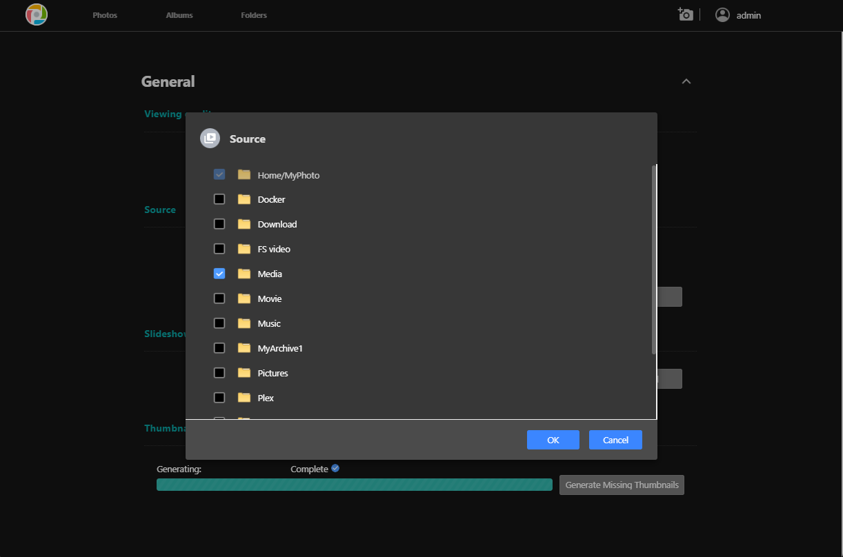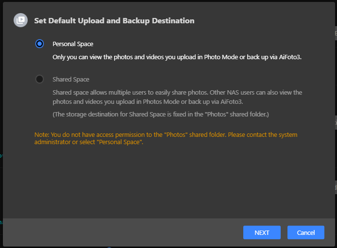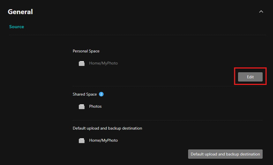 The designated personal space upload and backup path must be a media source folder to be selectable. Subsequently uploaded and backed-up photo collections will be stored within the specified folder.