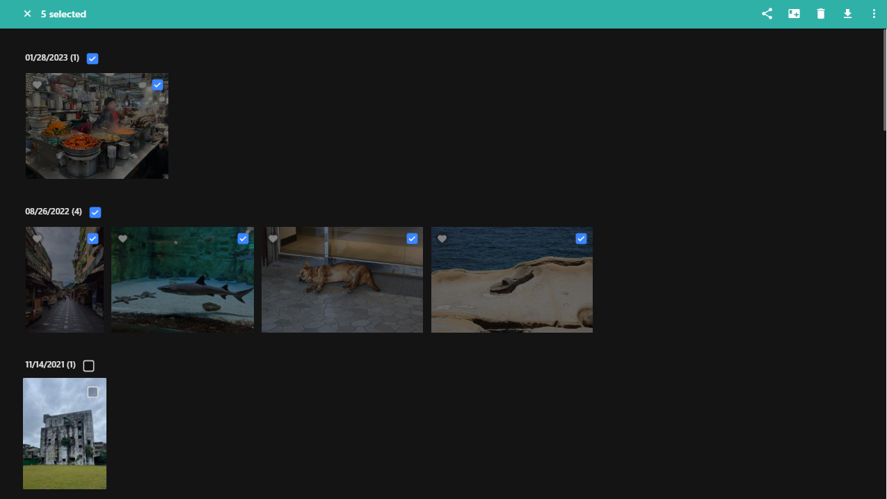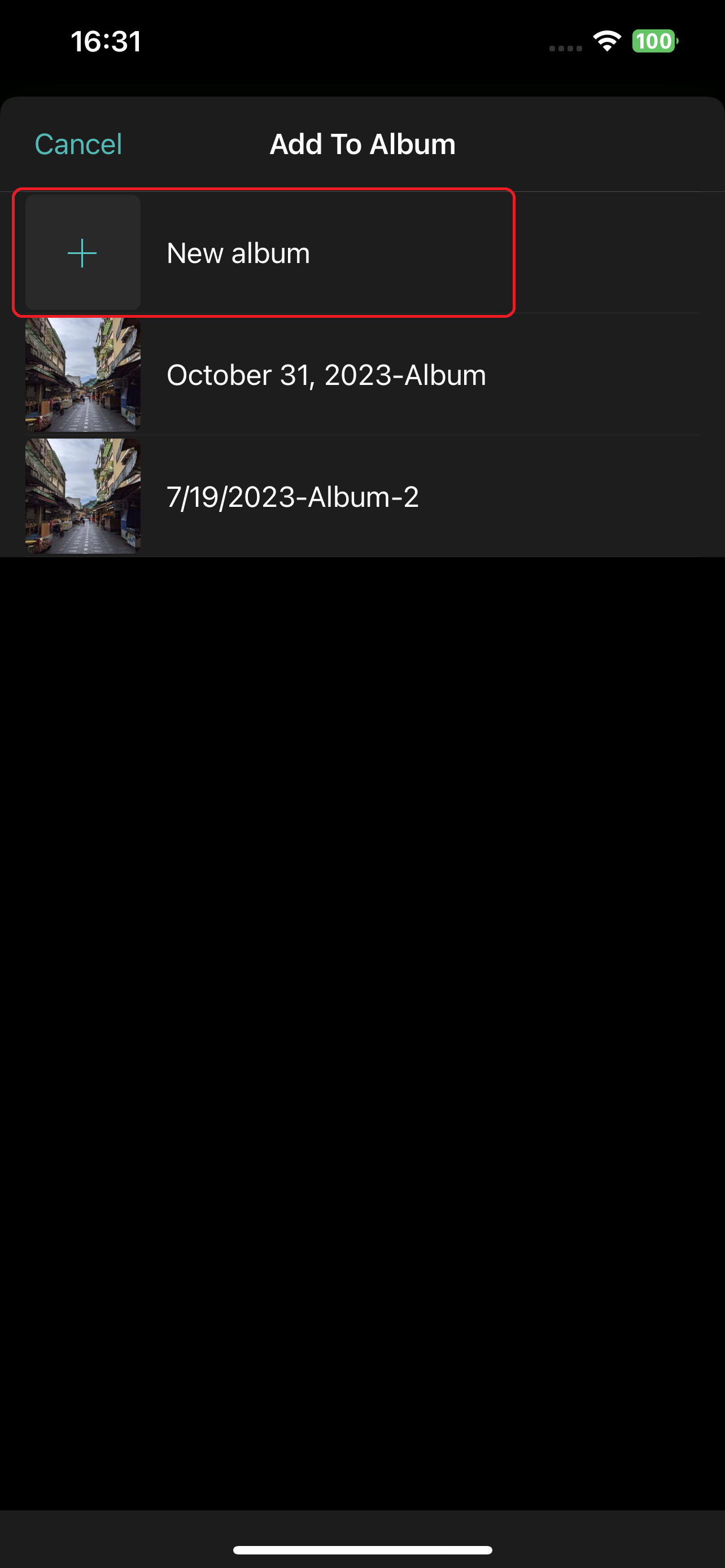 After selecting photos, photos can be added to an existing or new album.