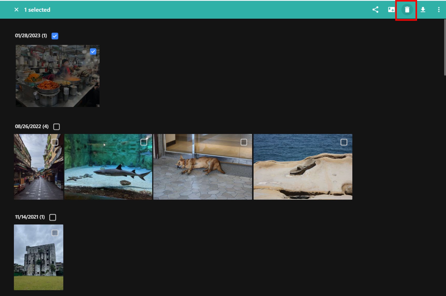 Photos can be shared, deleted, downloaded, tagged, rotated, added to favorites and added to an album.