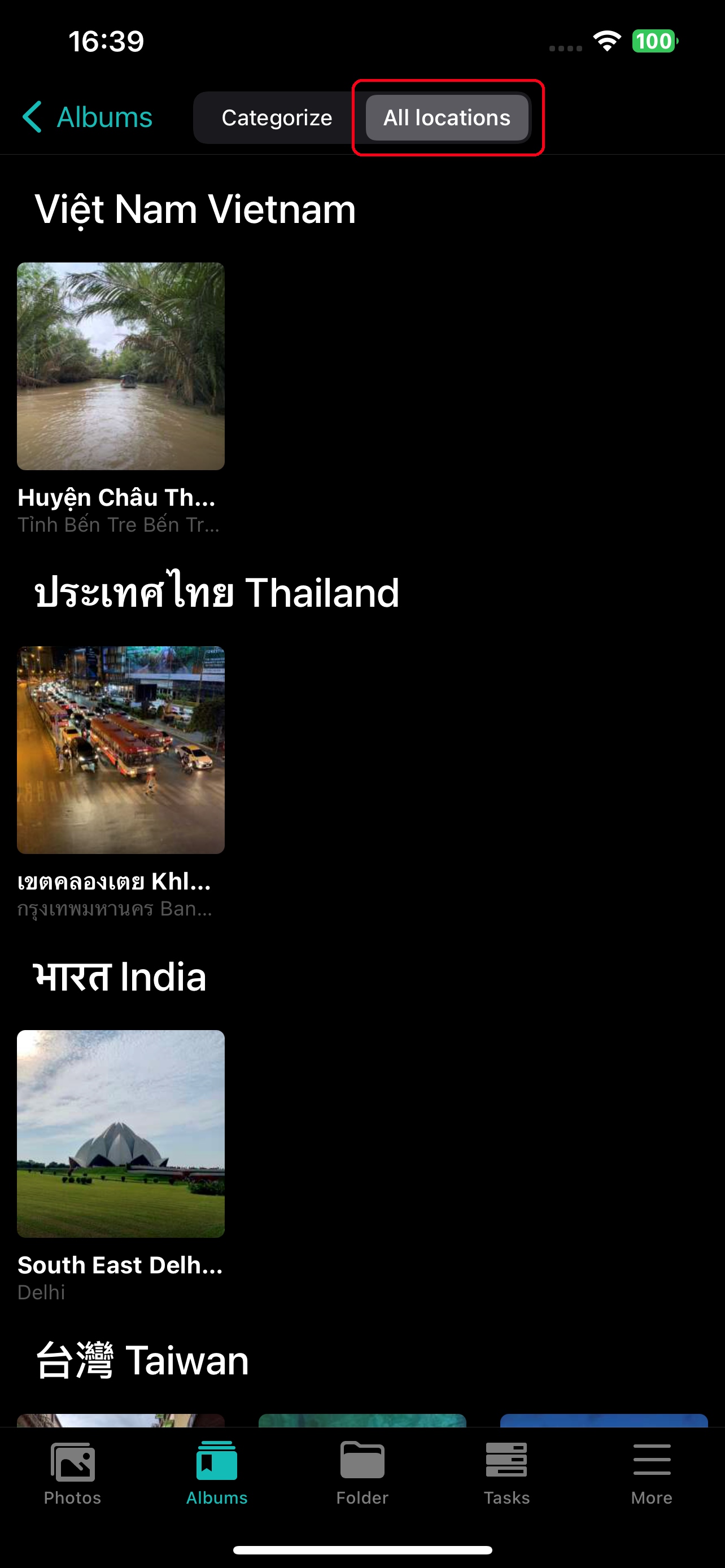 The location album contains two options: categorize and all locations. Categorize will list all photo locations by country and region. Click to enter the provincial/state/territorial/district level.