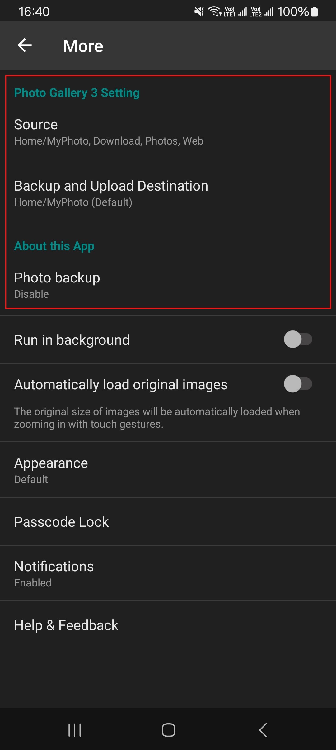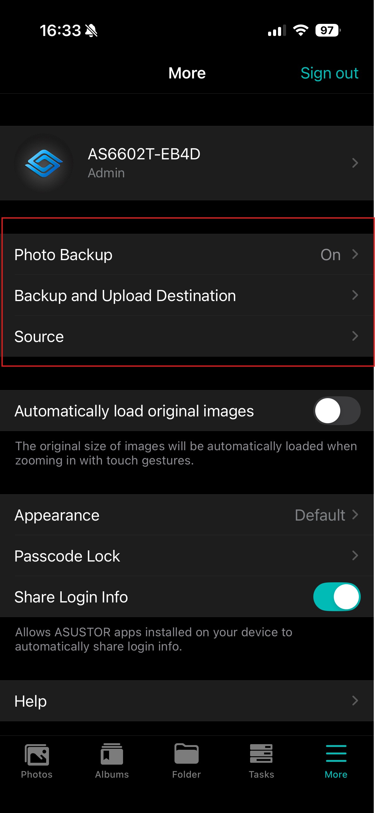 Clicking more gives more settings to adjust photo display quality, set automatic backups page, photo storage sources and support options.