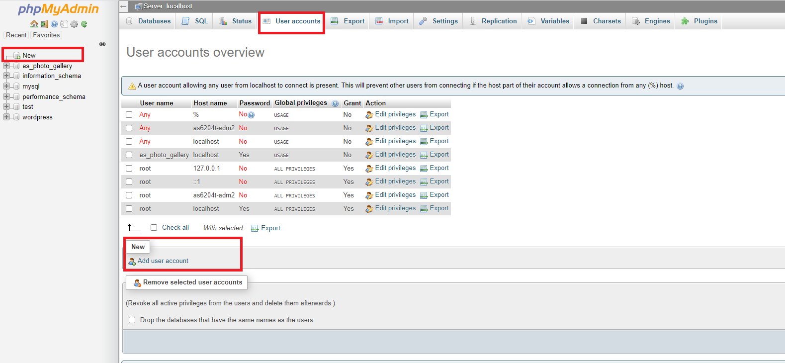 • Enter a new password and ensure that both checkboxes under Database for user accounts are enabled.