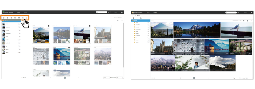 Photo Gallery provides users with 2 viewing modes: Album and Browsing. When in Album mode, no separation is provided between different subfolders, with all photos being visible for a seamless browsing experience. Album covers consist of a single image along with 4 smaller thumbnails of recently added photos. Administrators can configure album covers for easy identification while guests can get a preview of an album's contents from the 4 smaller thumbnails displayed. Selecting an album will cause a toolbar to be displayed in the upper left hand corner of the interface, giving users the functions to edit the album name and description, edit permissions, upload, download, move, copy, select all and deselect all. After opening an album, administrators will be able to enter an album description in the field above the photo wall. In Browsing mode, photo thumbnails replace the older folder icon display style. Users can use the original folder directory structure to browse photos.