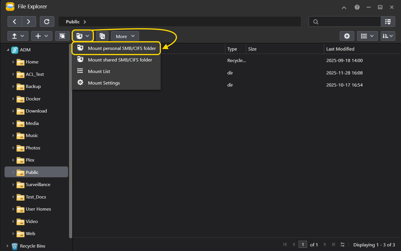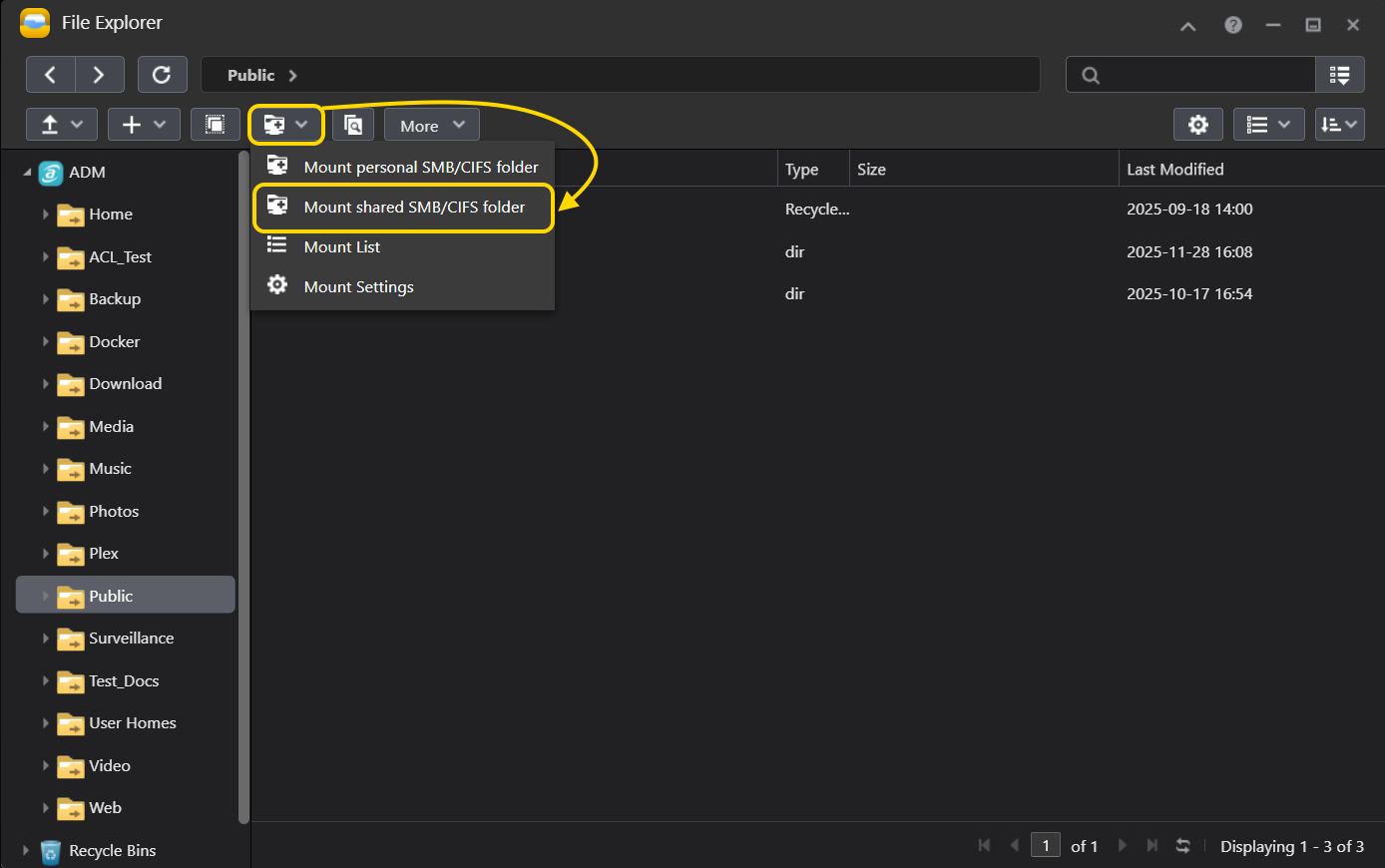 NAS administrators or users can mount folders from other devices on the same LAN as shared or personal SMB/CIFS folders, which can be accessed at any time in the ADM File Explorer.