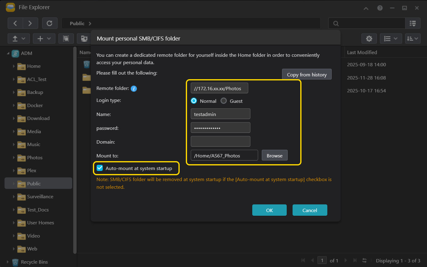 • Auto-mount at system startup: You can select whether to auto-mount on system startup. If you have not enabled this item, the SMB/CIFS folder will be automatically removed the next time the system starts up.