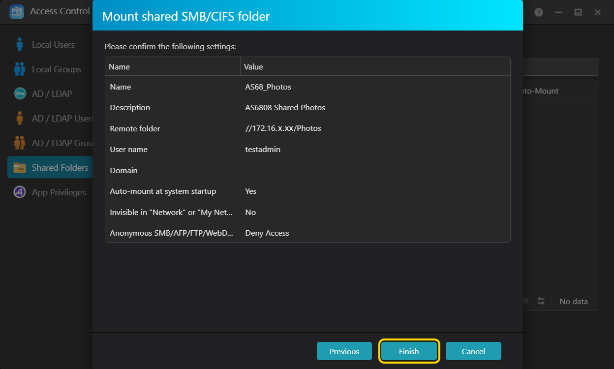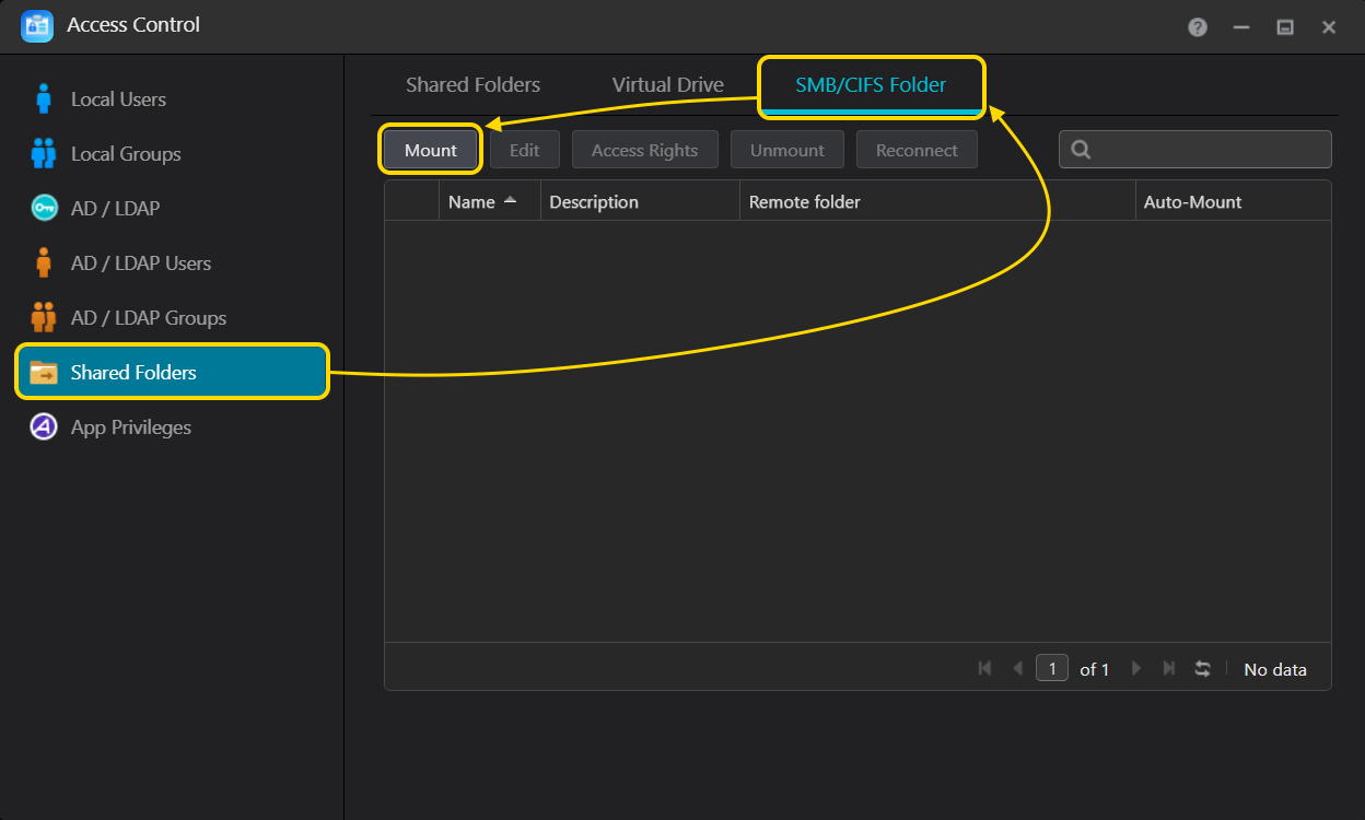 • The [Shared Folders] section on Access Control should now be visible. Select [SMB/CIFS Folder] and then click on the [Mount] button.