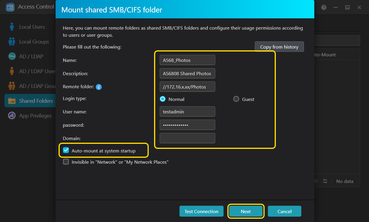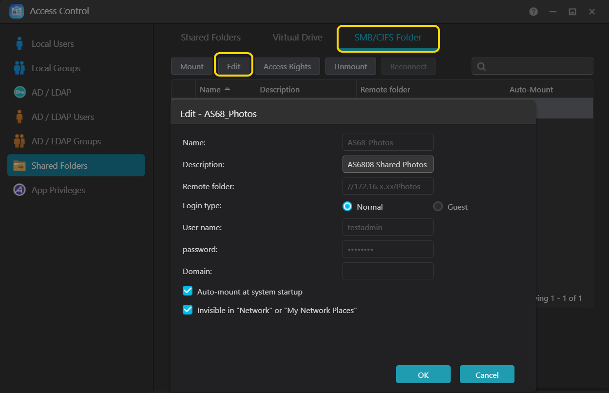 Mounting a personal SMB/CIFS folder allows you to take a certain folder from another NAS and mount it to your own file directory. Only the user that created the mounted folder will be able to view it. Other users on the NAS will be unable to view this folder.