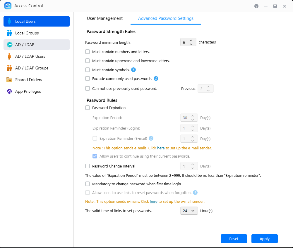 Windows Active Directory: After successfully adding your NAS to an Active Directory domain, you can then configure access rights using domain users, domain groups and shared folders settings using the Access Control app. Active Directory users can then use their own Active Directory accounts to log in and access the NAS.