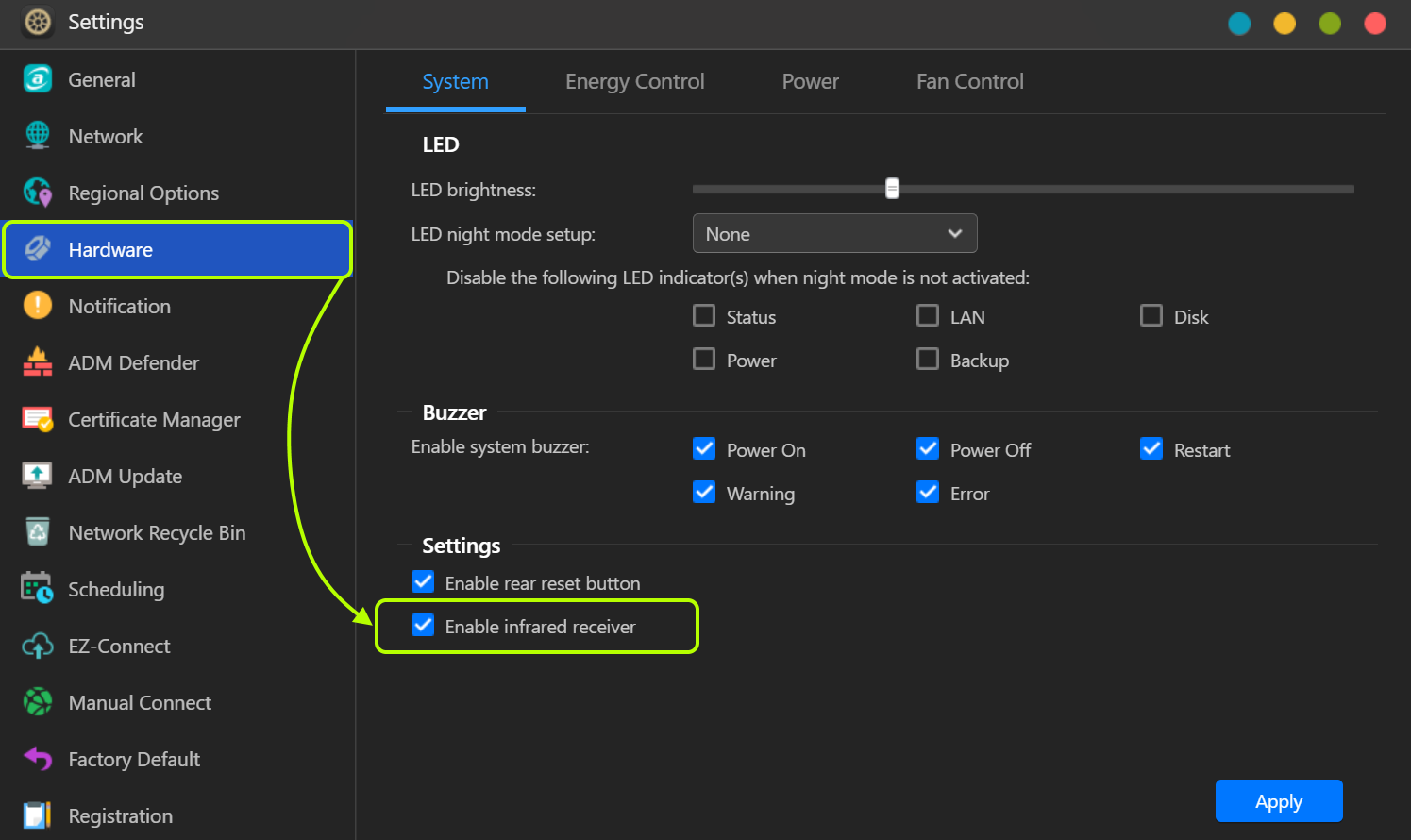 • Click on [Settings] [Hardware], and click on [Enable infrared receiver] to make sure that NAS can receive signals from ASUSTOR Remote Control.