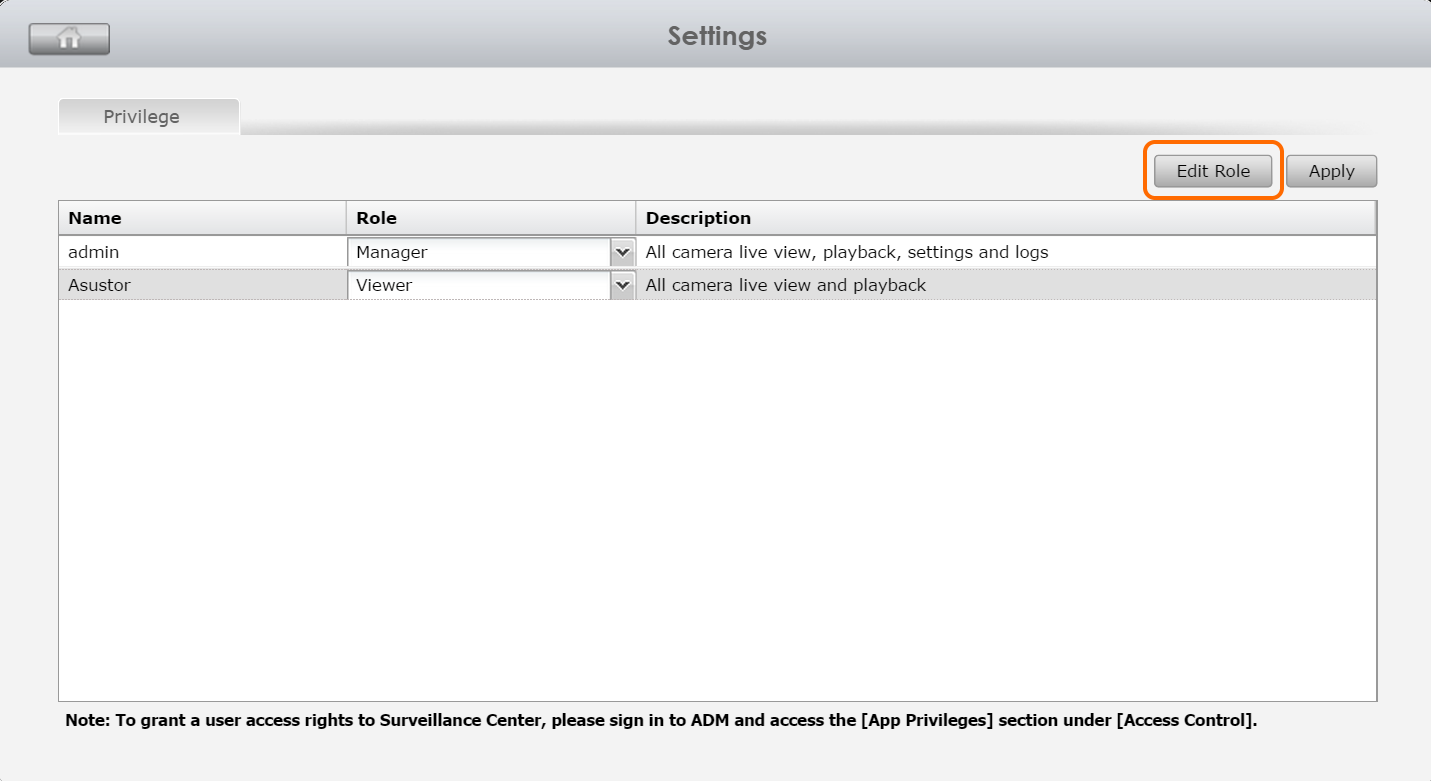 • Other than the administrators account, all other users will be set to "Viewer" by default. If you wish to configure user privileges, please select [Settings] [Privilege] [Edit Role] from within Surveillance Center.