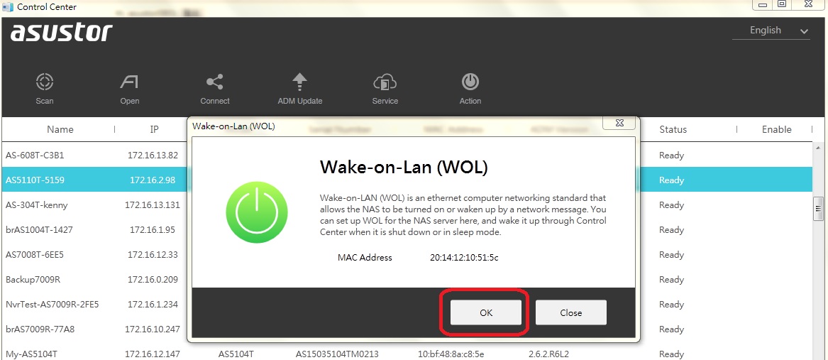 一旦執行 ASUSTOR Control Center,此工具會自動搜尋並列出區域網路上所有的 NAS。由列表清單選擇您要執行網路喚醒的 NAS,然後用滑鼠點擊右上角的 [操作]