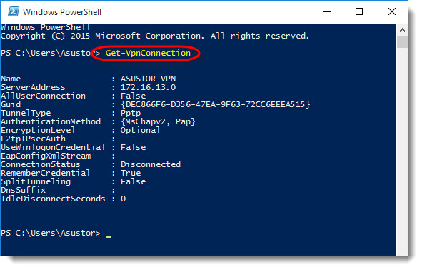 再輸入一次 Get-VpnConnection指令來確認以上修改已成功儲存至 VPN 配置中。